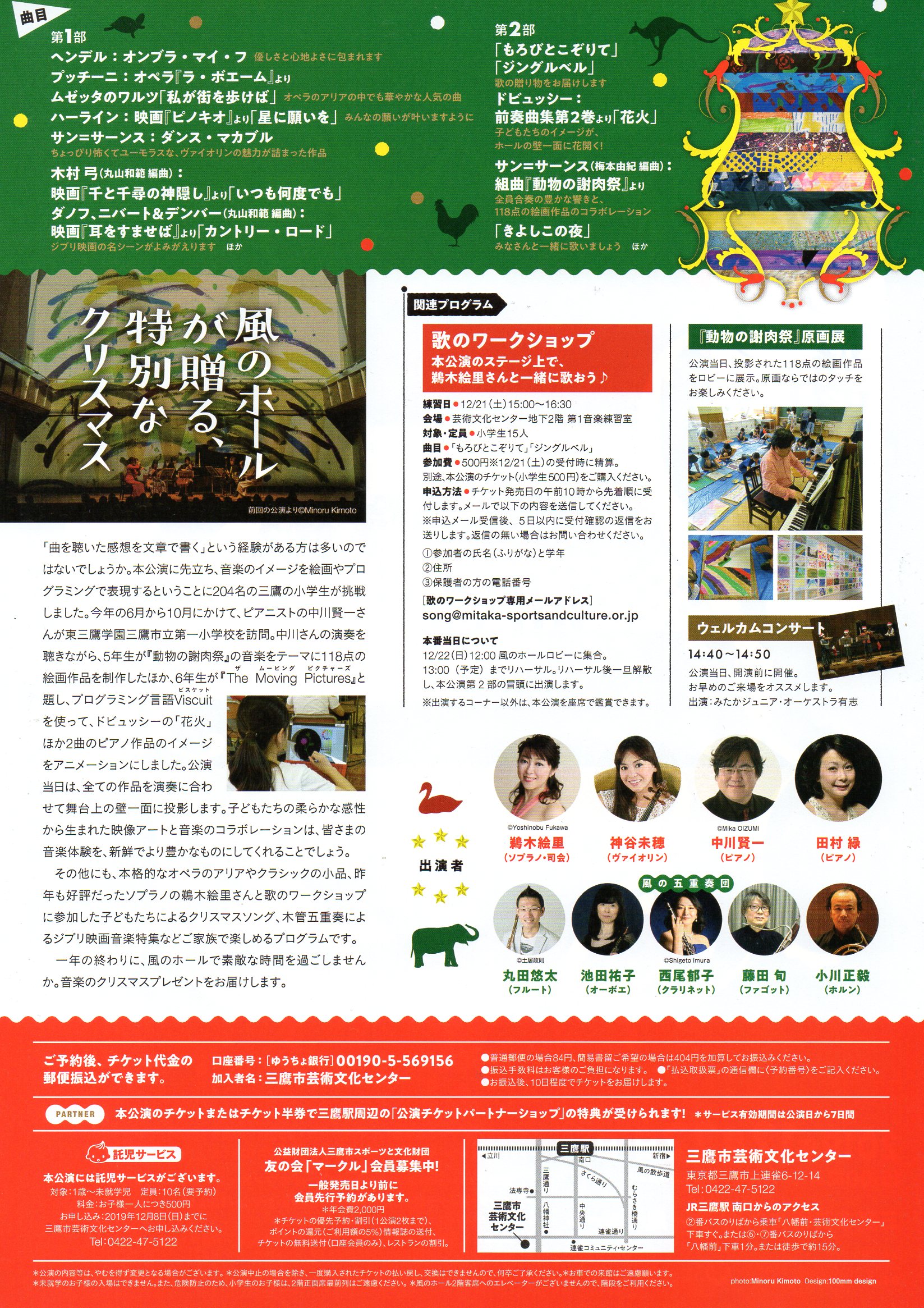 その他にも、本格的なオペラのアリアやクラシックの小品、昨年も好評だったソプラノの鵜木絵里さんと歌のワークショップに参加した子どもたちによるクリスマスソング、木管五重奏によるジブリ映画音楽特集などご家族で楽しめるプログラムです。